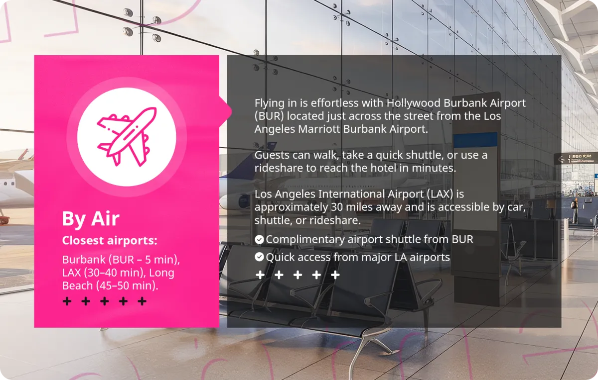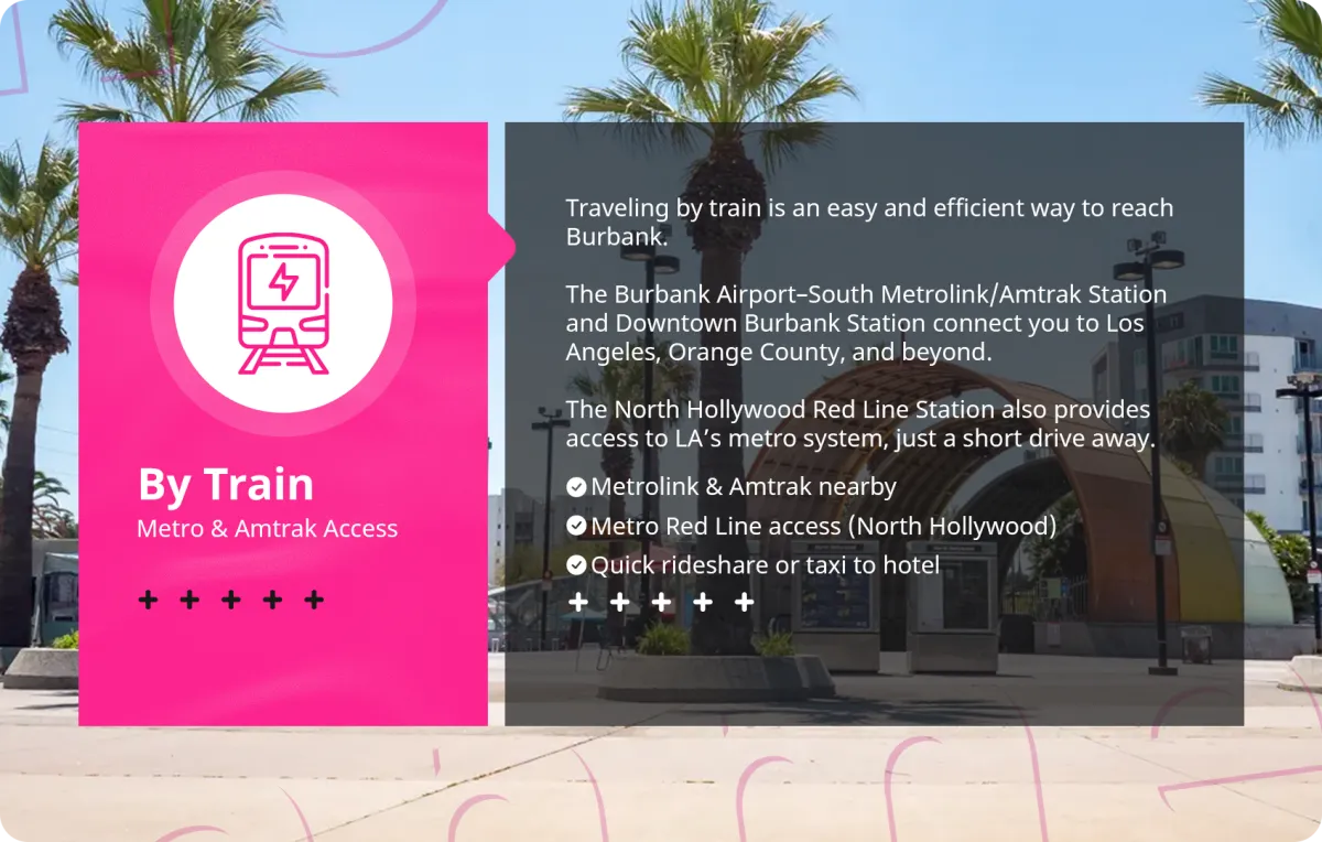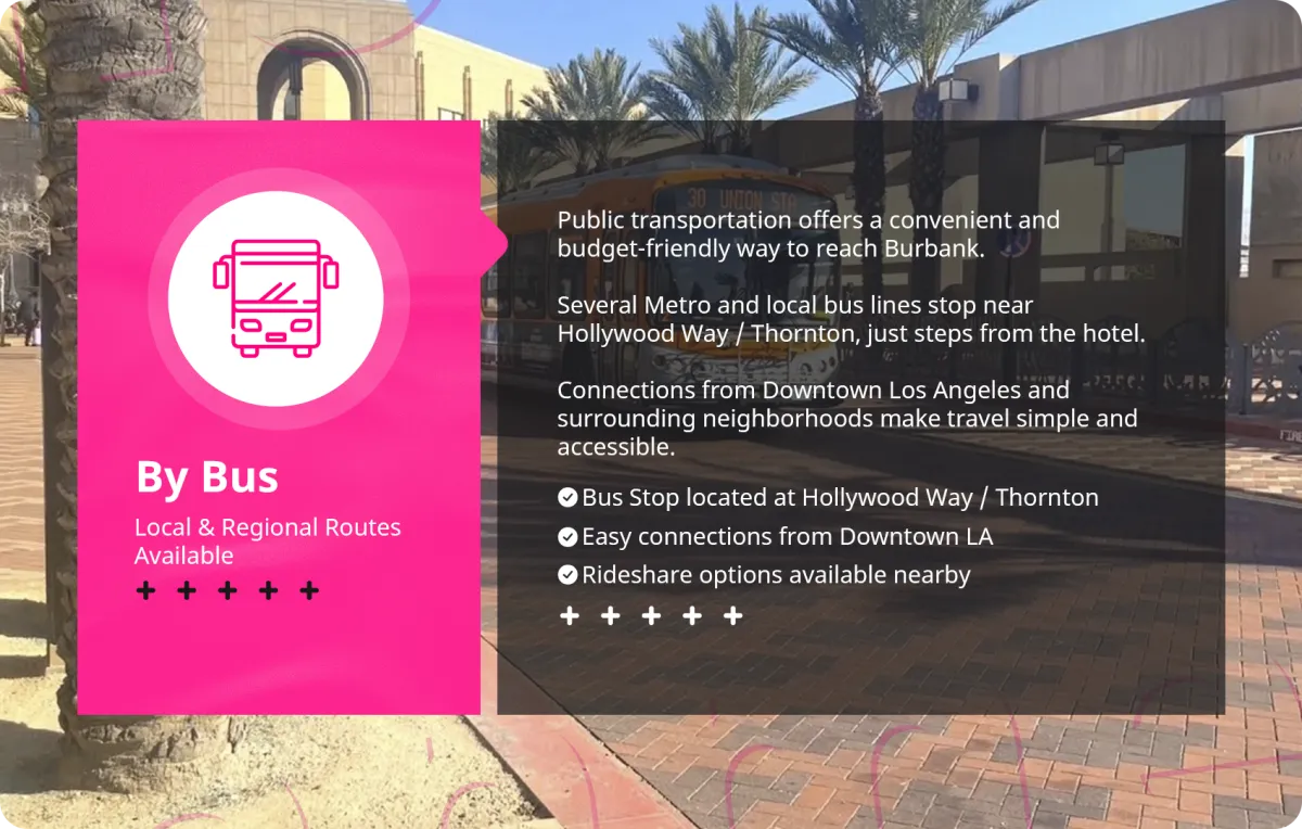 Fly into Burbank or LAX, then get around with ride-shares, car rentals, or the Metro. Convenient and flexible for every traveler.